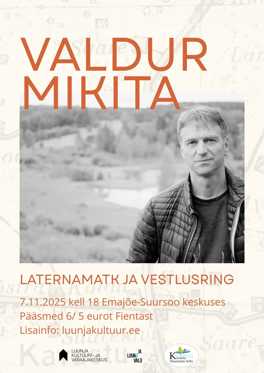 7. novembril 2025 kell 18.00 toimub Emajõe-Suursoo keskuses kohtumisõhtu kirjaniku Valdur Mikitaga. Õhtu algab umbes tunniajase laternamatkaga Emajõe-Suursoo rajal, kus kuulame vaikust ja uudistame laternavalgel pimedat novembrikuist metsa.Valdur Mikita on üks Eesti eripärasemaid mõtlejaid ja autoreid, kes on oma teostes avanud põhjamaist loodust ja eestlaste maailmatunnetust erilise poeetilisusega. Tema looming kutsub märkama nii meie keele kui kultuuri sügavust, aga ka looduse silmale nähtamatut jõudu. Avatud on kohvik.